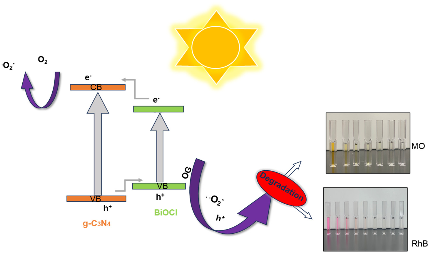| BiOCl/g-C3N4 | RhB/Visible light MO/Visible light | 90% (10 min) 100% (180 min) | 0.045 (180 min) 0.045 (180 min) | 18% | [21] |