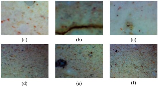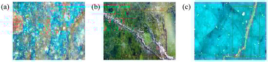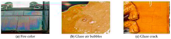 A common production-related issue is “fire color,” which appears on the surface of colored glaze components during firing. This issue arises when excessive pressure inside the kiln forces flames towards lower-pressure areas [18], creating a fire flow that impacts the glaze surface and causes the formation of fire color in Figure 2a. During the firing process, the oxides in the clay body and thick glaze layer release gas at high temperatures, forming bubbles on the glaze surface. If the heat retention time is insufficient, the glaze will not have enough time to melt and smooth out, leading to the formation of “bubble pits” (Figure 2b). Glaze Cracking (Figure 2c) is another common issue in all colored glaze components. When fired, the glaze reaches a boiling state, and the glaze stone becomes liquefied. As the temperature decreases, the glaze’s thermal expansion coefficient exceeds that of the body, preventing the glaze from adhering properly and resulting in surface cracks, which creates a potential vulnerability for further deterioration during the components’ subsequent use [19].