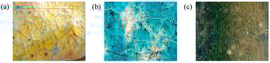 The morphology of glaze peeling on the HTWS samples: (a) peeling at the edge of the yellow glaze; (b) peeling of the green glaze surface; (c) peeling of the green glaze surface.