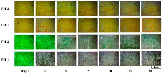 Video Microscopic Morphology: A microscope was used to examine the glaze’s morphology following corrosion in order to examine the microscopic morphology of the glazed tile surface. Figure 7 displays the outcomes. After 30 days of corrosion in a pH = 3 solution, yellow glazed tiles revealed no discernible surface alterations. A tiny quantity of white corrosion product particles were produced at the glaze’s fissures following a day of corrosion in a pH = 1 simulated corrosion solution [28]. As the corrosion period increased, the quantity of corrosion products progressively increased. Nearly all of the cracks in the field of view were enriched with corrosion product particles after 30 days of corrosion. After one day of corrosion in a pH = 3 solution, green glazed tiles had comparatively little glaze degradation. Corrosion products not only accumulated at the glaze’s fractures but also covered a significant portion of its surface. A significant amount of white, loose, granular corrosion products covered the glazing surface after one day of corrosion in a pH = 1 simulated corrosion solution. The corrosion morphology did not substantially alter after that.