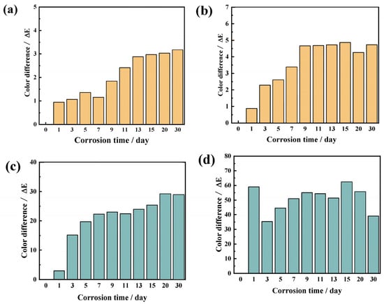 Color difference in glazed tiles under acid rain corrosion over 30 days: (a) Yellow glaze, pH = 3; (b) Yellow glaze, pH = 1; (c) Green glaze, pH = 3; (d) Green glaze, pH = 1.