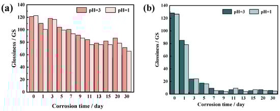 Gloss: After 30 days of corrosion in an acid rain simulation, Figure 9 illustrates how the gloss of glazed tile glazes changed. As corrosion time increased, the sheen of both green and yellow glazed tiles progressively diminished. The yellow glazed tiles’ shine decreased more in the pH = 1 corrosion solution than in the pH = 3 corrosion solution. The trend in Figure 9a shows that, beginning on day 9, the yellow glazed tiles’ decline in shine grew noticeably. The sample glazes showed significant gloss loss on day 30 of corrosion, with gloss loss rates of 46.58% (pH = 3) and 49.82% (pH = 1), respectively. Green-glazed tiles exhibited a greater reduction in shine during corrosion than yellow-glazed tiles. In the simulated acid rain corrosion solution at pH = 3, the gloss loss rate of the green glaze surface was 36.72% after one day of corrosion. The results indicate that under the same acidic corrosion conditions, the gloss loss rate of green glaze is significantly higher than that of yellow glaze.