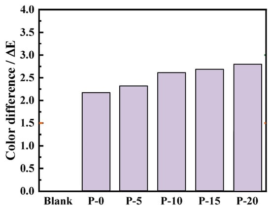 The principle of consistent style should be followed in the restoration and preservation of cultural artifacts, and samples should have similar colors before and after treatment. Figure 10 displays the samples’ morphology both before and after the coating materials was applied. The samples’ appearance was barely altered by the coating materials. The penetration effect was good and the reinforcing agent did not solidify significantly on the surface. Figure 11 illustrates how the samples’ surface colors changed after being treated with the coating materials. The surface color difference value of the sample with added PDMS–OH was slightly higher than that of the sample reinforced with pure TEOS, and it gradually increased with the increase in PDMS–OH content. However, the overall change was not large and the color difference value was in the range of 1.5~3, which was a very slight discoloration degree, and it was within the acceptable color difference range compared with the original glazed tile body [31].