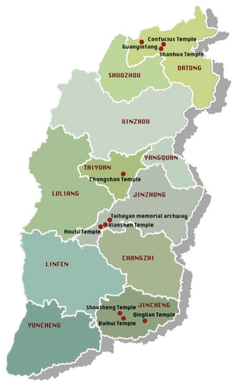 This study primarily examines the deterioration of colored glaze components in ancient buildings across Taiyuan, Jincheng, Datong, Jiexiu, Yangcheng, and other locations in Shanxi Province, encompassing the entire region. The detailed research locations are pointed in the following figure (Figure 1). All surveyed buildings are classified as National Key Protection Units, as shown in Table 1.