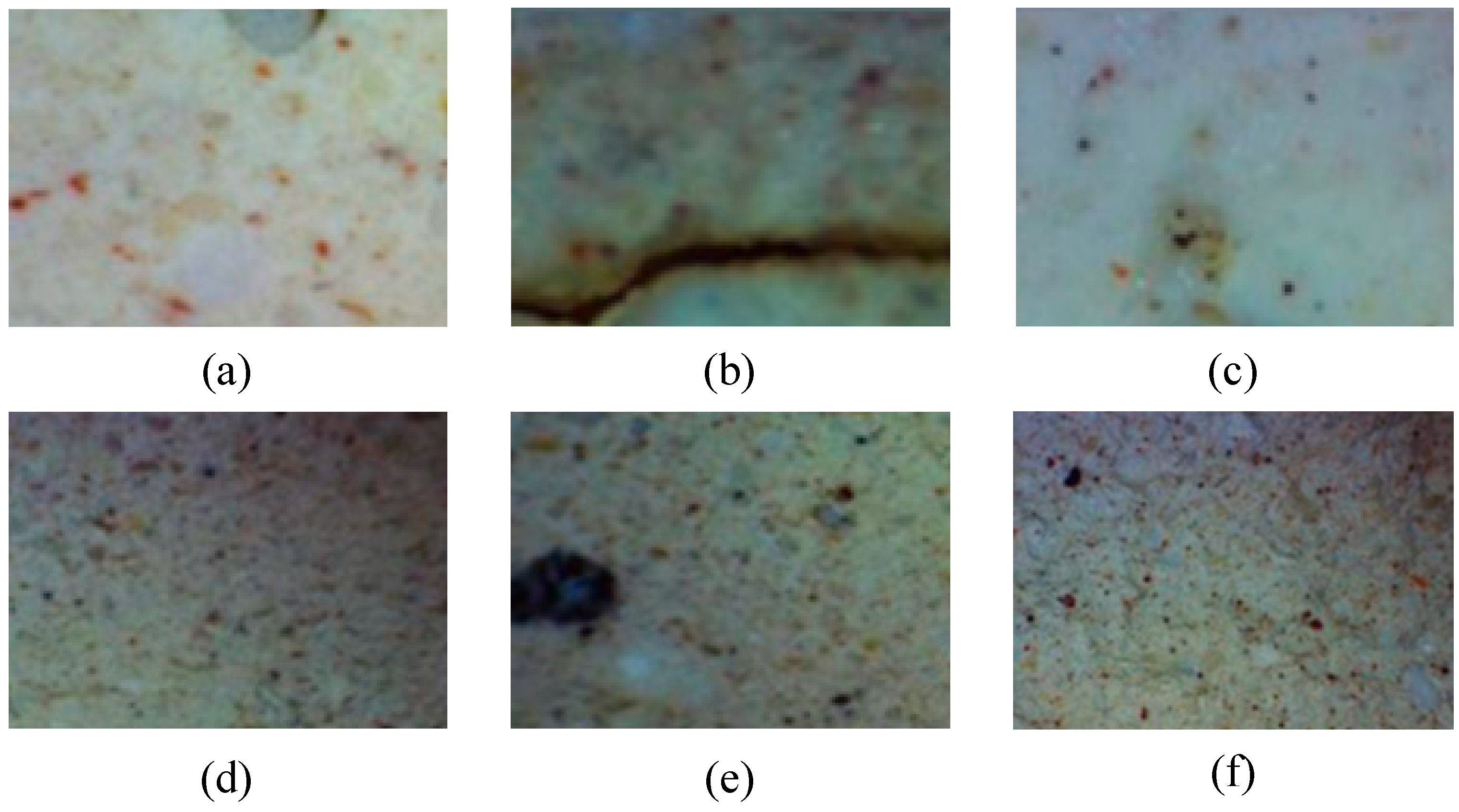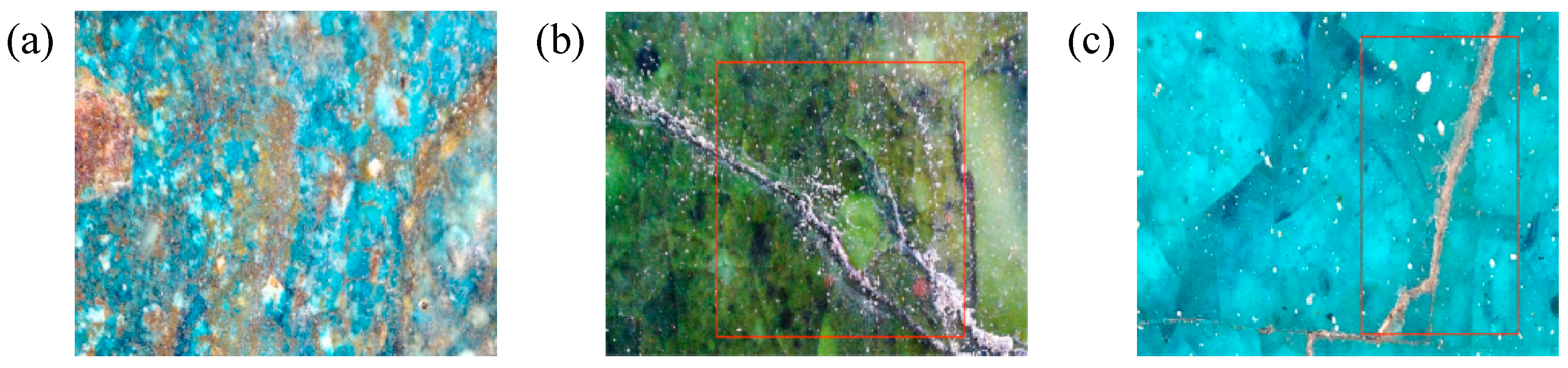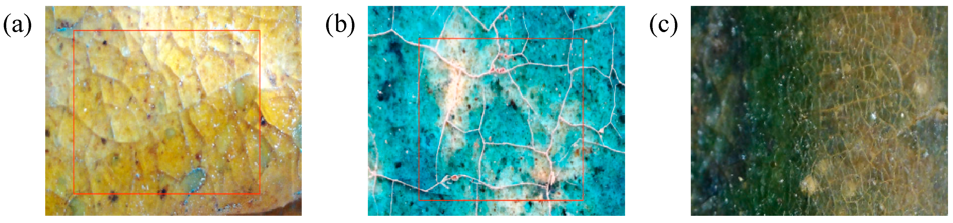 - Song, H.; Chen, Y.; Zheng, L. The Non-Destructive Testing of Architectural Heritage Surfaces via Machine Learning: A Case Study of Flat Tiles in the Jiangnan Region. Coatings 2025, 15, 761. [Google Scholar] [CrossRef]