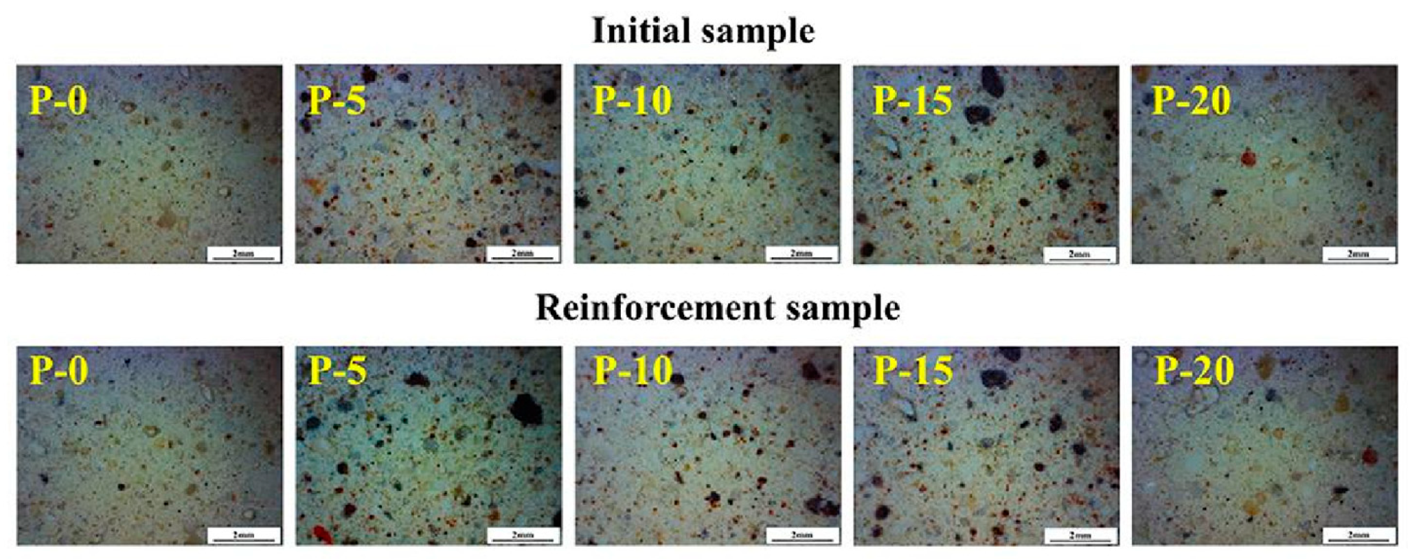 After reinforcement, the pore size of samples P-0 and E-10 was significantly reduced. The coating materials filled part of the pore network, and the matrix surface became smoother. This is consistent with SEM–EDS results showing a more uniform Si distribution after treatment, indicative of the TEOS-derived inorganic network penetrating and stabilising the degraded areas. The water absorption rate of the reinforced samples was significantly reduced, supported by the observed decrease in open porosity in the microstructural images. The main reasons are as follows: first, the matrix surface becomes hydrophobic, making it more difficult for water to penetrate. Second, the coating materials adheres to particles and fills internal pores. After reinforcement, the matrix porosity decreases, the structure becomes denser, and mechanical properties are significantly improved.