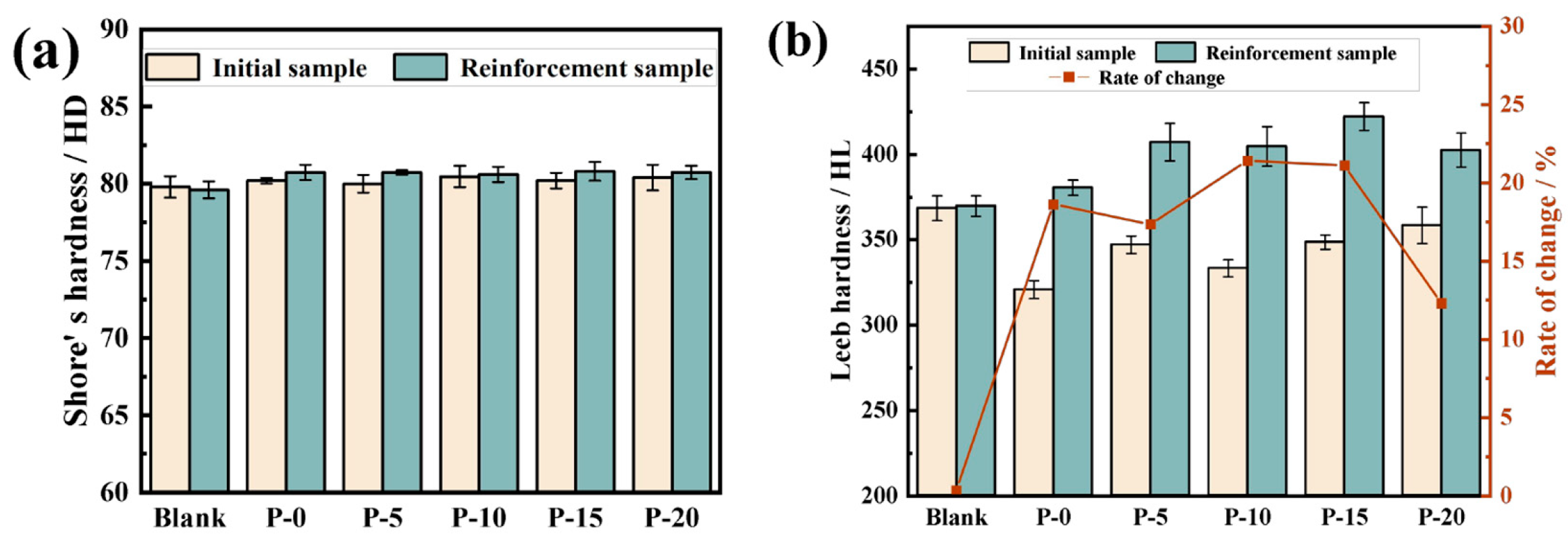Shore hardness, Leeb hardness, and rate of change in the matrix of samples with different PDMS–OH contents: (a) Shore hardness; (b) Leeb hardness.
