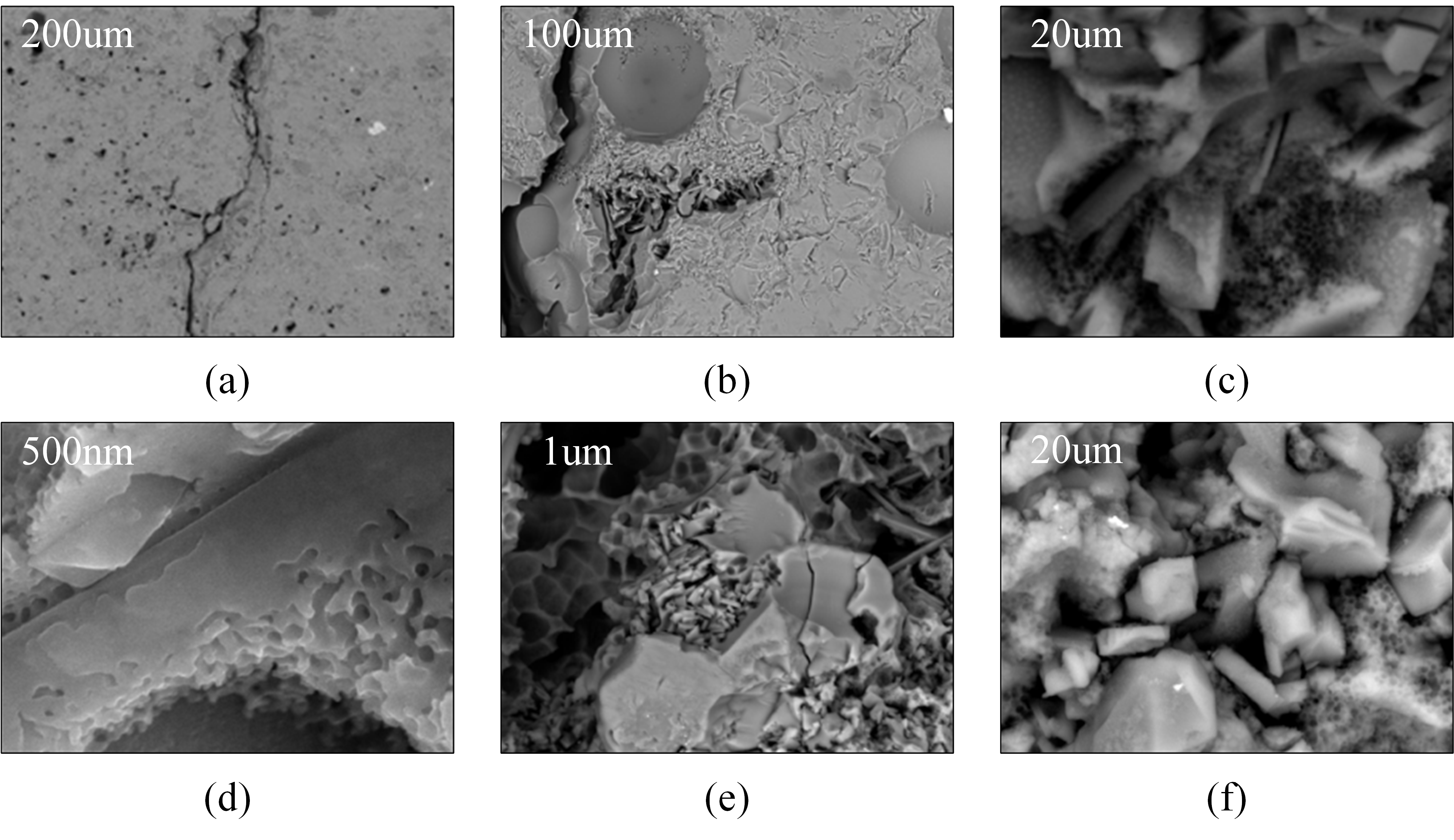 Morphology of HTWS specimen carcass failure: (a–c) Morphology of cracks and large particles at cracks; (d) Morphology of cracks and pores; (e) Morphology of interwoven cracks; (f) Morphology of pores.