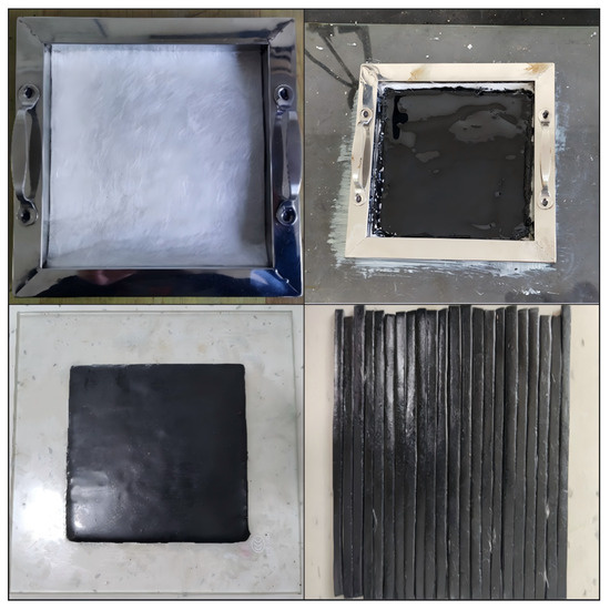 The limiting oxygen index (LOI) of the asphalt binder was determined in accordance with the JTG 3410-2025 standard [22]. A glass fiber surface felt measuring 150 mm × 150 mm was prepared and placed in a metal mold frame with an internal cavity measuring 151 mm × 151 mm × 3 mm. The warm-mix flame-retardant and smoke-suppressant asphalt binder, preheated to the target temperature, was then poured onto the glass fiber felt until it was fully saturated. After cooling to ambient temperature, the specimens were demolded and cut into strips 65 mm in length, as shown in Figure 2.