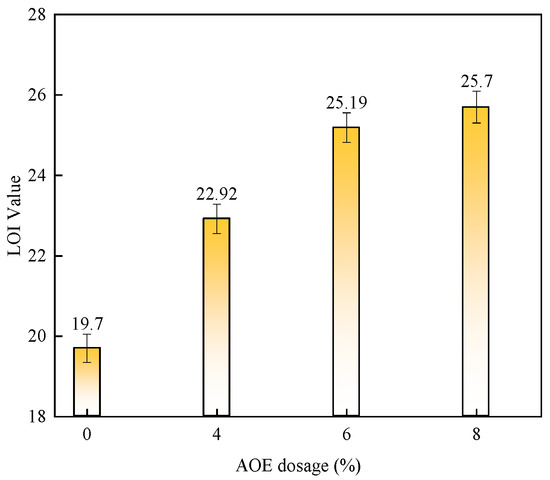 Figure 3 presents the test procedure and the measured limiting oxygen index (LOI) values. The data in Figure 3 indicate that the LOI increases with increasing AOE dosage, confirming that AOE effectively enhances the flame-retardant performance of the warm-mix asphalt binder. Specifically, the LOI values of AOE-0 and AOE-4 are 19.7% and 22.92%, respectively, neither of which satisfies the technical requirement of an LOI greater than 23% for flame-retardant asphalt. When the AOE dosage is 6%, the LOI of AOE-6 increases to 25.19%, which meets the relevant technical requirements. However, when the dosage is further increased to 8%, the LOI of AOE-8 is 25.70%, and the increment is significantly smaller than that observed from AOE-4 to AOE-6. Therefore, 6% was identified as the optimal AOE dosage.