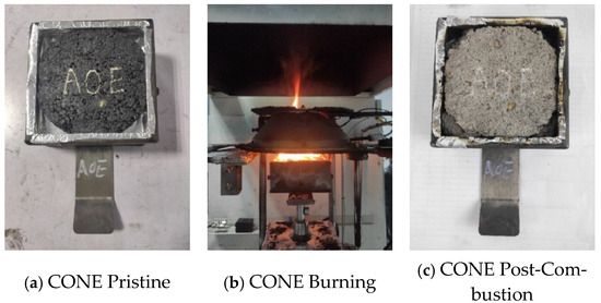 Two representative asphalt binders, AOE-0 and AOE-6, were selected for cone calorimetry testing. Thin Marshall specimens were fabricated by the Marshall compaction method and used as cone calorimeter (CONE) specimens, with the specimen height controlled to 10 ± 1 mm to ensure consistency and comparability of the test data. A VOUCH 6810 cone calorimeter was employed, and the combustion performance of the two asphalt mixture specimens was quantitatively characterized in accordance with ISO 5660-1:2015 [23]. A heat flux of 50 kW/m2 was selected to simulate the thermal environment of medium-scale fires and to approximate the heat-radiation characteristics of actual asphalt pavement fire scenarios. .