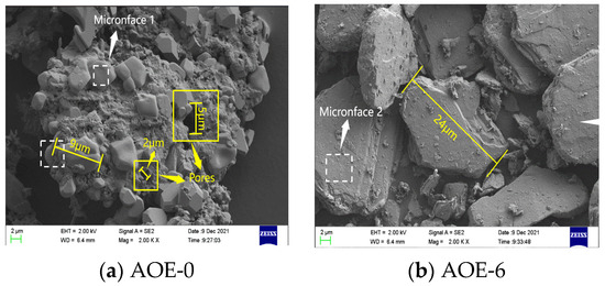 Considering that the SEM images of AOE-4, AOE-6, and AOE-8 are very similar, the present analysis of SEM images primarily focuses on the representative samples AOE-0 and AOE-6. Figure 7 presents the SEM micrographs of the residual carbon derived from AOE-0 and AOE-6 after combustion, acquired at a magnification of 2000×. As observed from the images, the surface of the AOE-0 residual carbon exhibits a loose and porous structure composed of fine particle aggregates, with pore sizes predominantly distributed between 2 and 5 μm and distinct interconnected macropores. This phenomenon can be attributed to the thermal decomposition of asphalt during combustion, during which light flammable components volatilize and escape rapidly, thereby rendering the residual carbon structure loose and forming numerous interconnected pores.