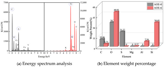 Figure 8b compares the elemental compositions of the AOE-0 and AOE-6 char residues. Upon addition of AOE, the surface O content increases by 15.2 wt%, while the C content decreases by 6.75 wt%. In combination with the SEM observations and the preceding analysis, this behavior can be attributed to the formation of a composite barrier layer on the asphalt surface during combustion. On the one hand, this barrier layer is enriched in oxygen-containing species (e.g., metal oxides and silicates) generated by the decomposition of AOE, thereby increasing the measured O content on the char surface. On the other hand, the barrier layer effectively covers the underlying asphalt, and the increased amounts of inorganic elements at the surface dilute the relative proportion of C, leading to the observed decrease in its measured weight percentage.