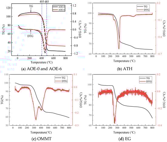 The mass loss of AOE-0 (neat asphalt) reaches 80.15%, whereas the AOE-6-modified asphalt exhibits superior thermal stability at 800 °C, demonstrating a mass loss of only 67.15% and a char residue content of 32.85%. Compared with the BMPA-Si composite flame-retardant asphalt reported in a recent study [24]—which requires a dosage of 8% but only achieves a char residue content of 24.67% at 750 °C—the AOE system demonstrates significant performance advantages, underscoring its dual merits of low dosage and enhanced thermal stability at elevated temperatures. The exceptional performance originates from the synergistic flame-retardant mechanism among ATH, OMMT, and EG within the AOE system. This synergistic pathway is directly evidenced by the characteristics of the TG–DTG curves presented in Figure 9a–d.