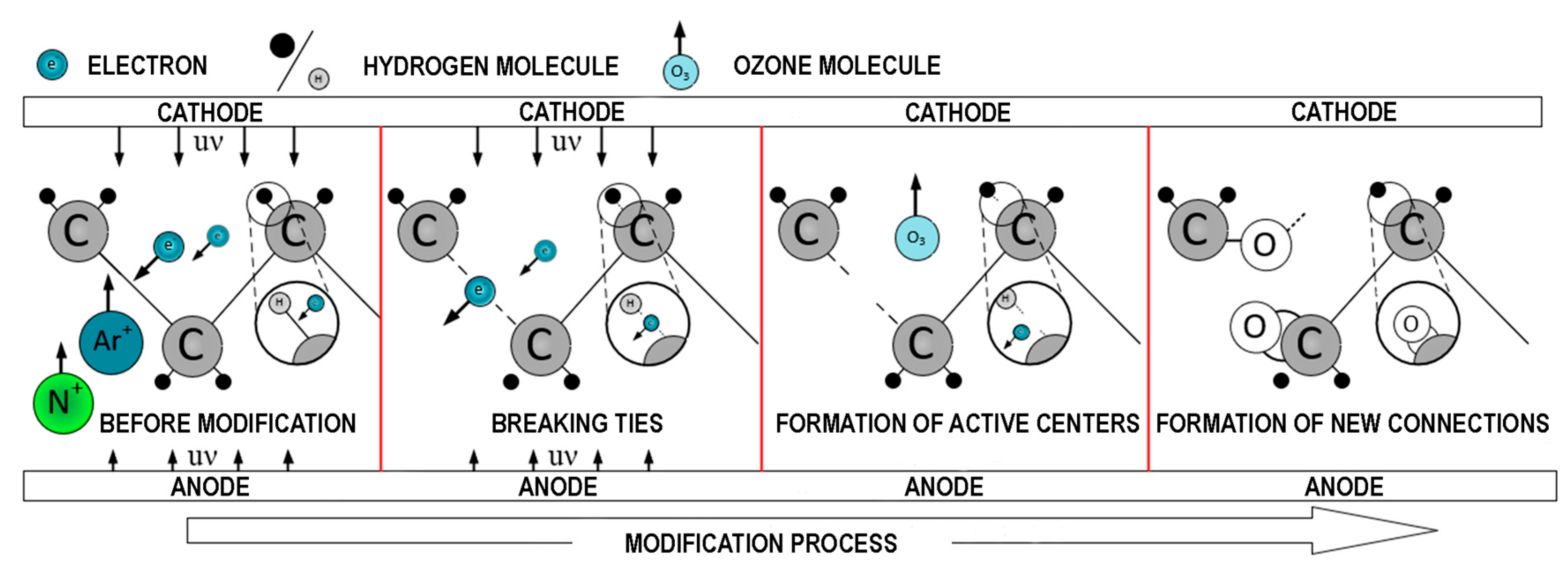 Figure 16). If the material being modified is located in the plasma beam region, accelerated charged particles break the bonds between carbon and hydrogen molecules, triggering the formation of highly reactive active sites. If the plasma beam is separated from the polymer material being modified, only chemical interaction with plasma atoms and radicals occurs.