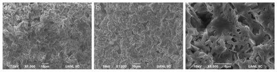 The incorporation of brown algae into the Simonkolleite coatings was investigated by different techniques to evaluate its effect on the physical and chemical properties of the resulting materials. Figure 1 shows the surface morphology of the reference Simonkolleite and the coatings modified with brown algae. At the same magnification (1000×), the images reveal a similarly compact morphology (Figure 1a,b); meanwhile, a closer analysis of the algae-modified sample shows morphological changes induced by its incorporation, including increased porosity at the micrometer scale and the formation of leaf-like features (Figure 1c).