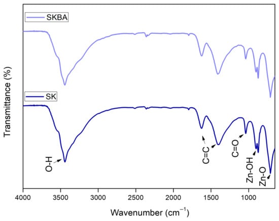 FTIR spectra of the SK and SKBA coatings are shown in Figure 3. Both spectra exhibit a broad absorption band around 3400 cm−1, attributed to O–H stretching vibrations, due to physically adsorbed water or hydroxyl groups [28]. Additional bands appear at 1630 and 1406 cm−1, corresponding to C=C stretching vibrations [29]. A small band around 1041 cm−1 is assigned to C=O stretching from organic moieties introduced by the algae or possibly to sample carbonation [30]. Furthermore, absorption bands below 1000 cm−1 in both spectra are attributed to Zn–OH and Zn–O vibrations [31] of the Simonkolleite phase. However, no significant differences were observed between the spectra.