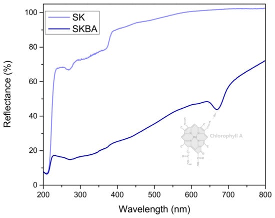 Diffuse reflectance spectra of the coatings are shown in Figure 4. The SK coating exhibits high reflectance throughout the visible region, indicating limited light absorption and a typical response for inorganic materials with low chromophoric content. In contrast, the SKBA coating presents a significantly lower reflectance, particularly in the visible region, suggesting enhanced light absorption due to the presence of brown algae. A notable absorption band occurs around 672 nm in the SKBA spectrum, which is consistent with the characteristic absorption of chlorophyll A [32], one of the main pigments found in brown algae. This evidence shows that the incorporation of photosensitive organic components may contribute to the photocatalytic or light-interacting properties of the modified coatings. The reduced reflectance of SKBA implies potential for improved solar light utilization, which could be advantageous in applications such as photocatalysis or solar coatings.