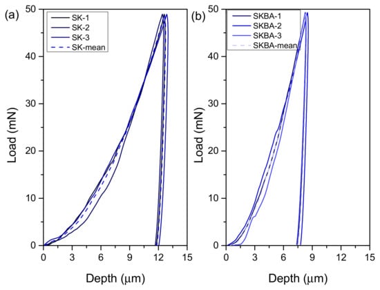 The load–displacement curves of the (a) SK and (b) SKBA coatings.