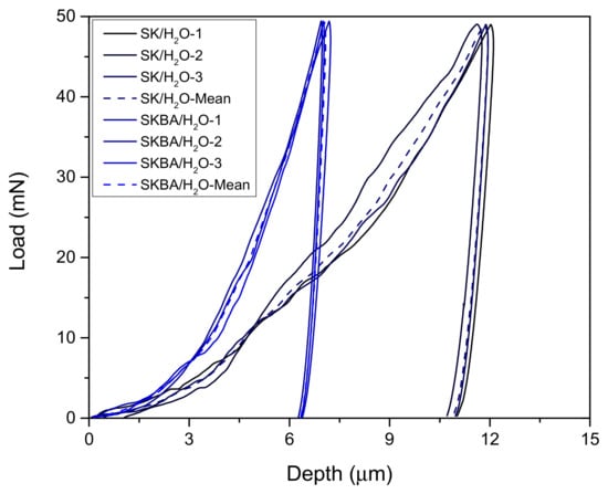 The load–displacement curves of the SK and SKBA coatings after being immersed 7 d in water.