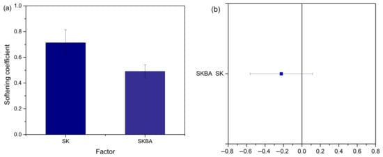 (a) Softening coefficient of the SK and SKBA coatings after being immersed for 7 d in water, (b) Means comparison using Tukey test (α = 0.05).