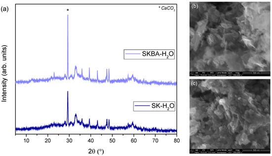 In addition, X-ray diffraction analysis was carried out to verify the stability of the crystal phase after water immersion. The diffraction patterns of both samples after the treatment confirmed that the main crystalline phase (Simonkolleite) remained, with no evidence of secondary or decomposition phases (Figure 10a). However, the crystallinity of the Simonkolleite decreased after water immersion and the signal from the sample holder (CaCO3) was more evident, particularly in the SKBA sample due to the presence of algae. In summary, these results indicate that the immersion in water did not significantly alter the crystalline structure of the coatings, and that the observed mechanical softening was mainly associated with microstructural changes (e.g., pore evolution) rather than phase transformations. Therefore, the Simonkolleite phase exhibits good chemical stability under aqueous conditions in the presence of brown algae, reinforcing its potential for applications where long-term exposure to humidity or water is expected. In addition, SEM micrographs show the characteristic lamellar morphology of SK, which confirms that the primary crystalline phase is preserved after water immersion (Figure 10b); meanwhile, SKBA exhibits densely stacked aggregates (Figure 10c). These features suggest a local refinement of the microstructure rather than the formation of interconnected porosity.