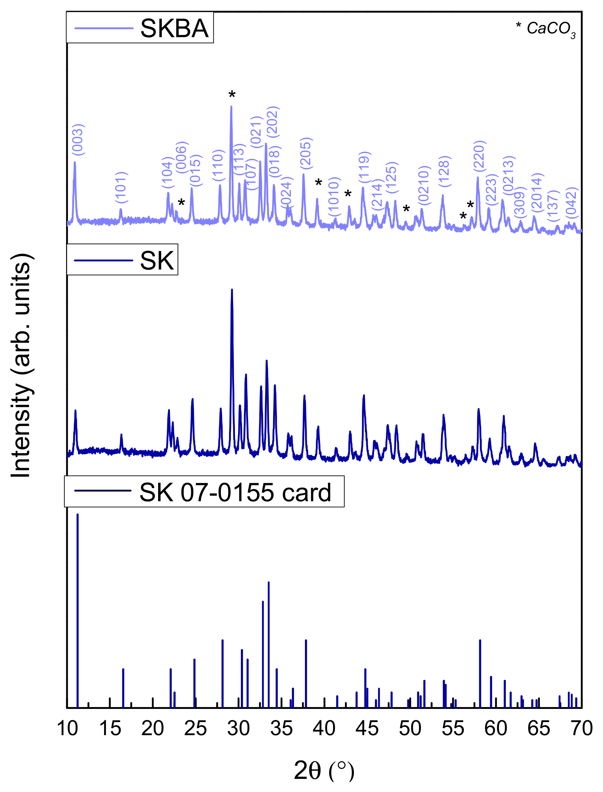 - Mellado-Lira, E.A.; Luévano-Hipólito, E.; Torres-Martínez, L.M. Brown algae: Sargassum sp. and Lobophora sp. incorporation in magnesium oxychloride cement. Sustain. Chem. Pharm. 2025, 44, 101969. [Google Scholar] [CrossRef]