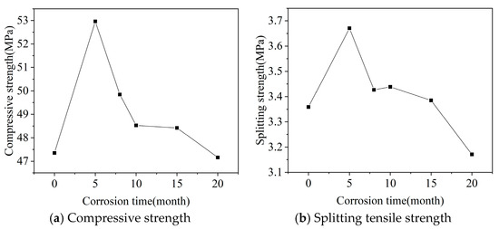 Cube compressive strength and splitting tensile strength of concrete after different dry-wet cycles are shown in Figure 1. From Figure 1a, it can be seen that the cube compressive strength of concrete generally shows a trend of first increasing and then decreasing with the increase in dry-wet cycles. The compressive strength of uncorroded specimens is 47.35 MPa, reaching the peak at 5 months with an average strength of about 52.97 MPa, an increase of about 11.87% compared to uncorroded concrete. At 8 months, the compressive strength is 49.85 MPa, a decrease of about 5.89% from the peak; from 8 to 10 months, a decrease of about 2.61%; from 10 to 15 months, little change in strength; at 20 months, compressive strength is 47.16 MPa, a decrease of about 2.6% from 15 months.