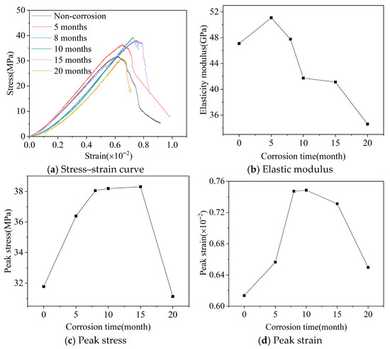 From Figure 2a, comparing the stress–strain curves of concrete after different dry-wet cycles with uncorroded specimens, at 5 months the strain value is less than that of uncorroded concrete at the same stress level, indicating that corrosion at this time has improved the concrete’s resistance to deformation to some extent; as dry-wet cycles increase, the degree of concrete corrosion gradually intensifies, and it can be clearly seen from the figure that after 8, 10, 15, and 20 months dry-wet cycles, the concrete’s resistance to deformation gradually decreases, with corroded strain values greater than uncorroded at the same stress level, and the gap between the two increases with dry-wet cycles. The reason is that under the action of external corrosion solution, many microcracks are generated inside the concrete due to the expansion of corrosion products, and the number of microcracks gradually increases with corrosion, leading to the need to pass a gradually increasing distance in the compaction process under compression as dry-wet cycle time increases at the same stress level, specifically manifested as gradually increasing concrete strain.