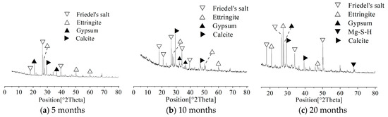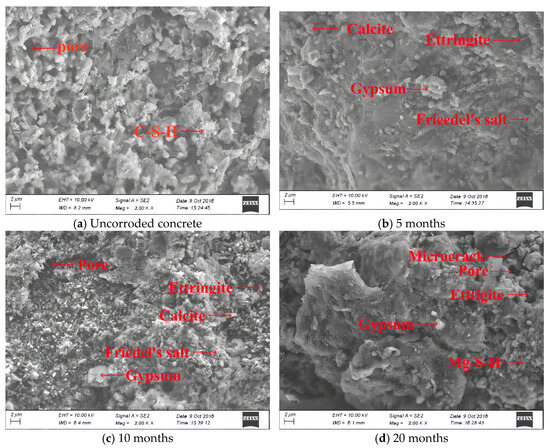 From Figure 3d, it can be seen that numerous pores and microcracks have developed inside the concrete, indicating that prolonged corrosion has caused significant damage to the internal structure. XRD analysis results show the existence of M-S-H. After magnesium ions enter the concrete, they react with C-S-H through ion exchange, displacing Ca2+ and restructuring the silicate chains to generate M-S-H (magnesium silicate hydrate) [8,37,38]. M-S-H exhibits lower structural integrity and mechanical strength than C-S-H, further contributing to the decline in concrete performance.