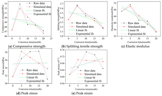 The calculation process for the grey theory GM(1,1) prediction models of concrete’s splitting tensile strength, elastic modulus, peak stress, and peak strain on the stress–strain curve follows the same procedure as described above. Their respective prediction models are: