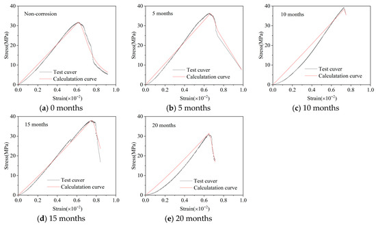Substituting different corrosion times (t = 0, 5, 10, 15, 20 months) into Equations (28) and (29) yields the corresponding theoretical complete curves. As shown in Figure 6, the model-calculated curves compare well with the experimental results. The ascending branch shows high agreement with the test curves at all corrosion ages, indicating that the model accurately captures the stiffness degradation law of concrete caused by corrosion. Although the experimental data for the descending branch show some scatter due to increased material brittleness and damage accumulation, the empirical Formula (29) still reasonably reflects the overall trend of rapid loss of bearing capacity, achieving satisfactory accuracy within an engineering-acceptable range.