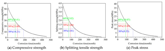 The selection of 50% residual splitting tensile strength as the failure criterion is justified by its widespread use in concrete durability assessments, particularly in aggressive environments where tensile strength governs serviceability limits due to cracking, spalling, and loss of structural integrity [44,45]. This threshold represents a conservative point at which corrosion-induced damage typically compromises the structure’s ability to withstand service loads. It is also supported by literature indicating that approximately 50% strength loss is a common indicator of advanced corrosion in reinforced concrete, beyond which repair or replacement is often required to prevent failure [46].