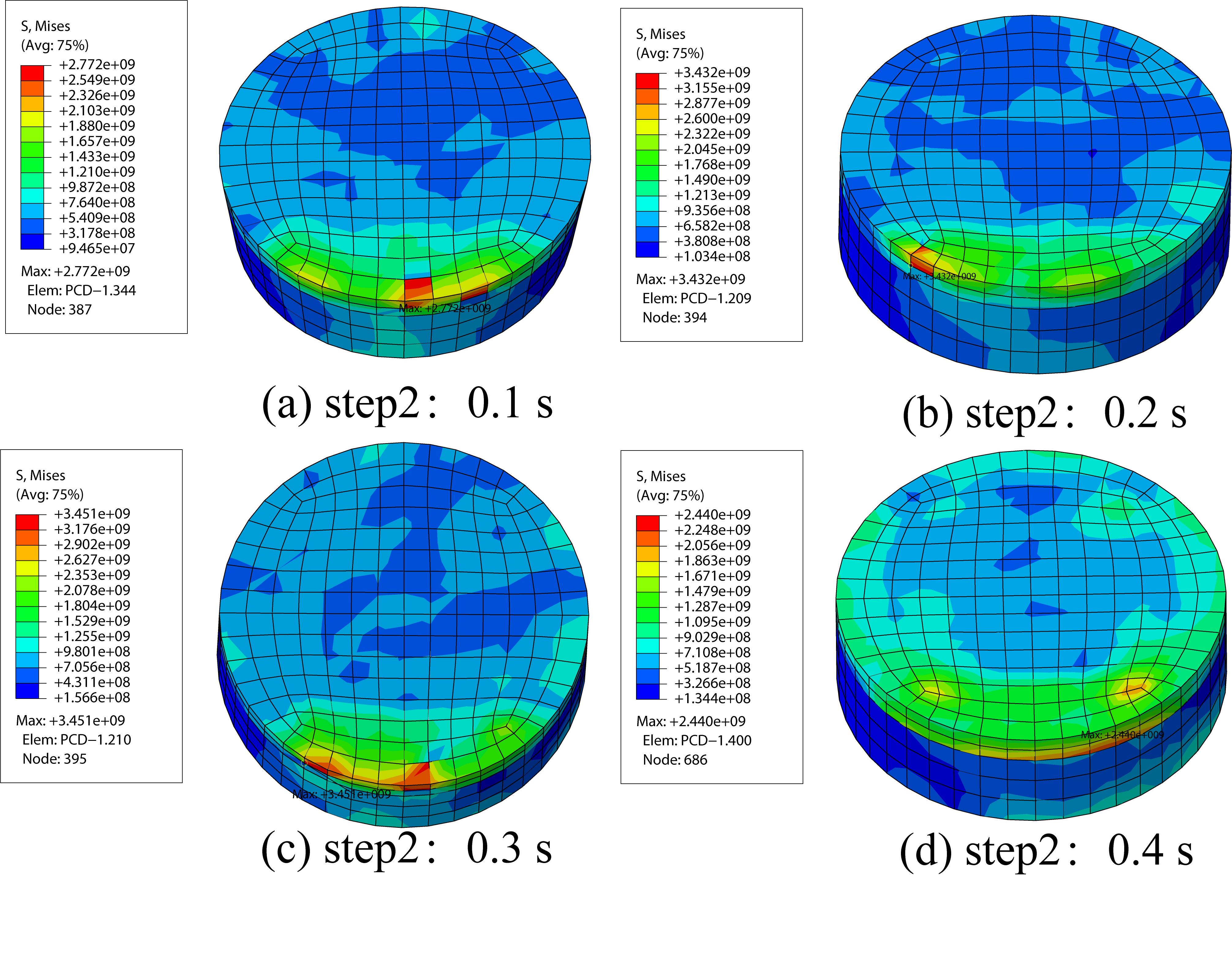 - Increasing formation temperature reduces the internal temperature gradient within the cutter, thereby mitigating thermal stress. As the formation temperature rose from 27 °C to 250 °C, the temperature difference between the maximum and minimum points on the cutter decreased from 72.6 °C to 35.6 °C. However, due to material heterogeneity and differential thermal expansion, significant thermal stress still develops, with the maximum equivalent stress (2.84 GPa) occurring at a formation temperature of 50 °C.