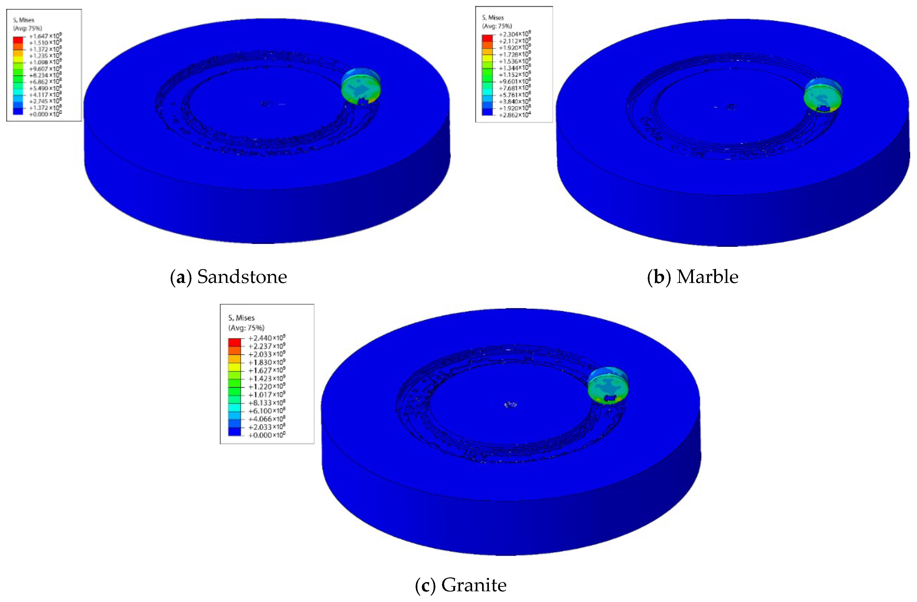 - The stress distribution in the PDC cutter is highly concentrated at the crown and at the interface between the diamond layer and the tungsten carbide matrix. Both the magnitude and fluctuation amplitude of stress increase with rock strength. The average stress when breaking granite (2.128 GPa) was 58.2% and 134.8% higher than when breaking marble (1.345 GPa) and sandstone (0.906 GPa), respectively. Stress evolution during cutting shows an initial sharp increase followed by fluctuations, with greater instability observed in harder rocks.