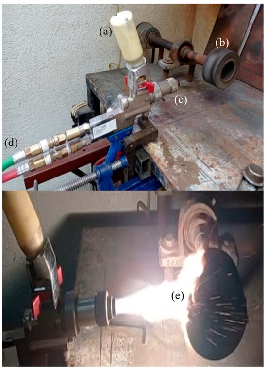 Thermal projection system: (a) powder tank, (b) rotary sample holder, (c) thermal gun, (d) gases houses supplier, and (e) application of the coating.