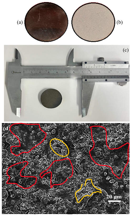 Inconel 718 substrates: (a) without sanded surface, (b) after sanded process, (c) with Co-based coating, and (d) contrasted image for the analysis of splat morphology (colored borders will mean like-features surfaces).