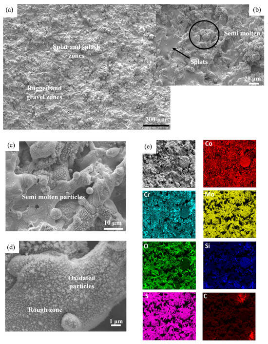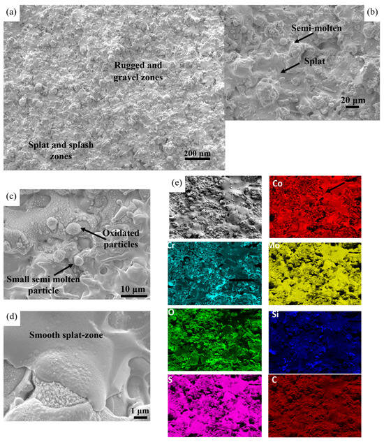 Figure 4a–d show micrographs of the coating developed at a thermal spray distance of 8 cm. From these figures, it can be observed that the microstructure is formed by rugged and splat regions. The figures also show small satellite spherical particles. Figure 4e shows the EDS mapping elemental analysis, which shows a homogeneous elemental distribution of Co and Cr, followed by Mo and S, and a less uniform distribution of Si and C. The presence of high contents of Cr and O suggests the formation of oxides of chrome. Moreover, the presence of a large number of molten particles and very few, or no, semi-molten particles was observed. This observation can signify that an atmosphere rich in oxygen was promoted at a high flame temperature during the spray process, consequently leading to the formation of oxides.