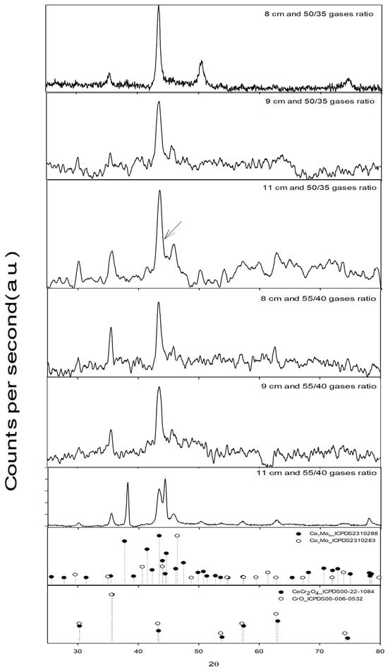 X-ray diffraction analyses were also performed in order to identify the crystal structure of the developed hard coatings for the different gas ratios and spray distances of the LVOF process. Figure 10 shows the X-ray analysis for thermal spray distances of 8, 9, and 11 cm and gas ratios of 50/35 and 55/40, respectively. From Figure 10, the crystallographic composition was observed for spray distances of 8 cm, 9 cm, and 11 cm, with a gas ratio of 35/50. In these figures, two cobalt phases Co7Mo6 and Co3Mo were mainly identified, with ICSD indexed patterns 03-065-8115 and 23-102-83, respectively.