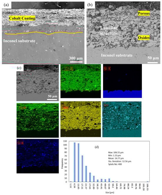 Thus, this preheating has been carefully controlled to limit as much as possible the development of oxide layers on the alloy substrate surface. The BSEM observed in Figure 11c shows that the EDS analysis did not show the presence of any oxide layer. Figure 11d shows the size distribution of the formed splats in the coatings. Hence, the proper performance of the coatings can be clearly associated with the formation of their characteristic microstructure.