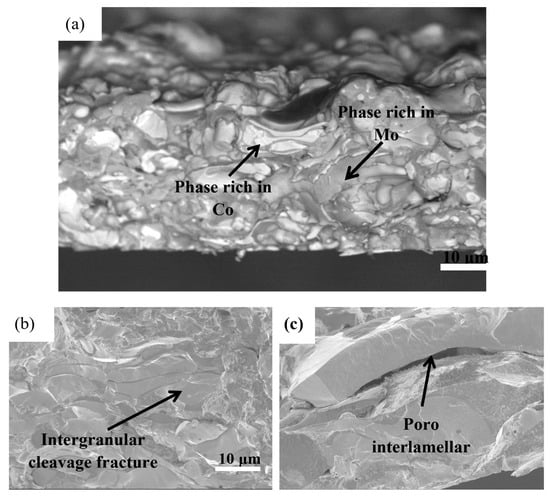 A short-sized microcrack was also found near the coating surface. Therefore, it can be assumed that microcrack nucleation occurred during bending, at the substrate/coating interface. Therefore, a competition between the porosity and microcracks, under some level of plasticity in the coating, is involved during the break process. Figure 15b shows crack propagation through the lamella’s microstructure. A distortion zone of fracture morphology is shown in Figure 15c, which can show that Co-based coatings experience microcrack nucleation under low plastic deformation, followed by propagation. Additionally, lamellas cracking was observed in regions rich in Co, suggesting that lamellas with flat morphology and rich in cobalt microparticles, can cleavage the coating’s microstructure. Nonetheless, some molten zones showed a quasi-ductile behavior, with small dimples or pool morphologies. Nevertheless, because the analysis of fracture nucleation and propagation mechanisms are not the object of the present work, the fracture behavior of Co-based powders coatings will be studied in a future work and submitted for publication.