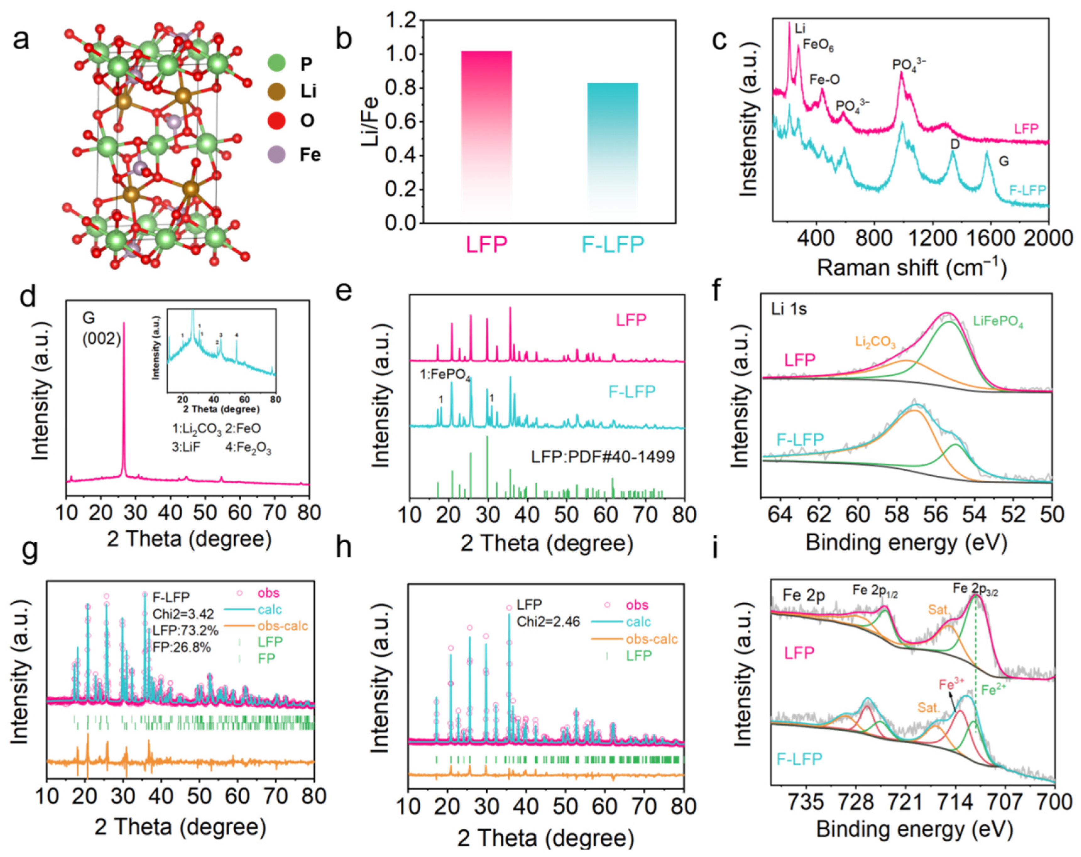 Figure 2b. Before cycling, the Li/Fe ratio was 1.02, and after cycling in the failed batteries (F-LFP), it dropped to 0.83, confirming the reduction of active lithium. Similar characterization was also confirmed in the Raman spectrum. In