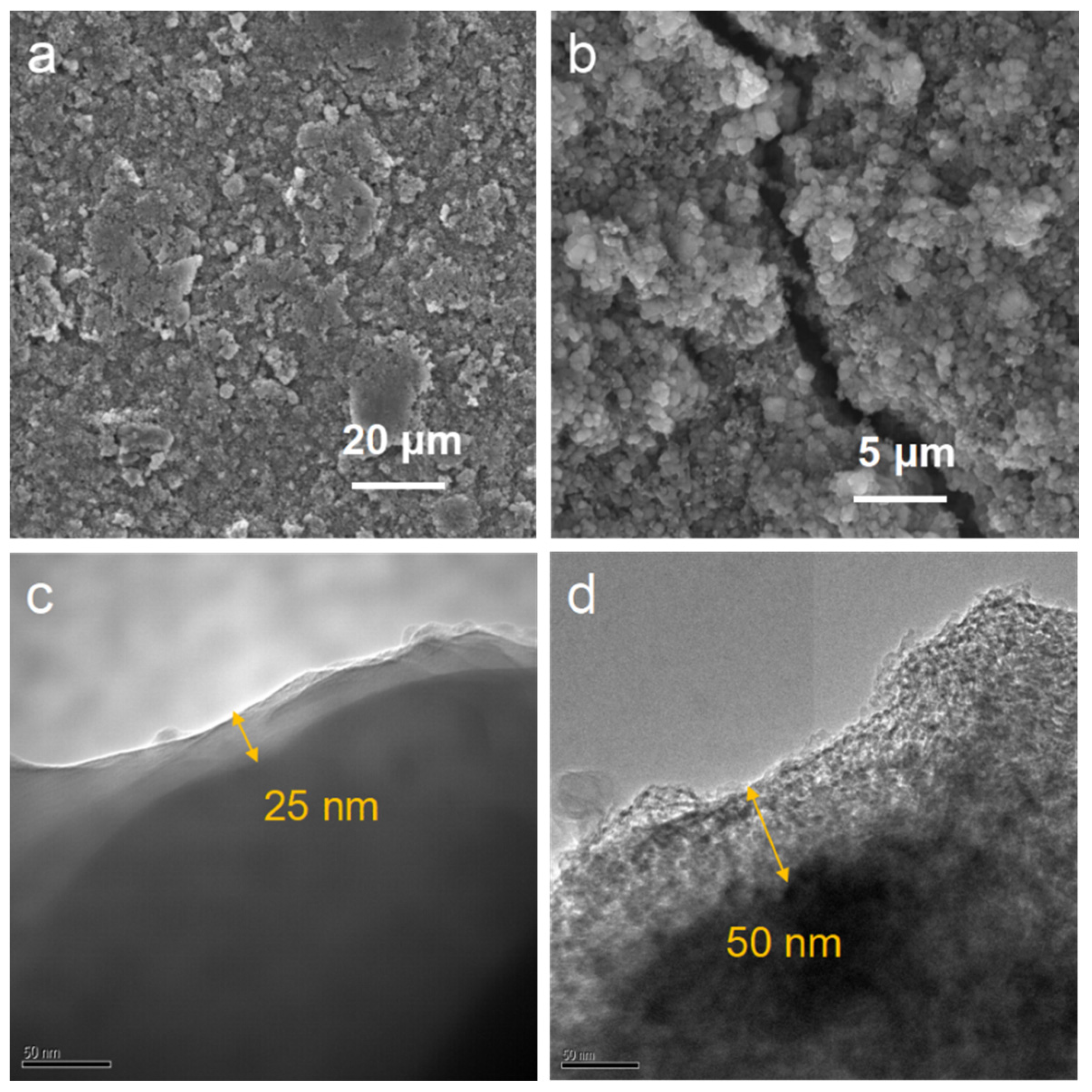 Figure 3b, and obvious cracks appear in the electrode. The sampling process was carried out strictly in accordance with statistical methods. The sampling method was random sampling while ensuring an adequate sample size at the same time and maintaining an inert environment during sampling to avoid introducing interfering factors during the sample preparation process. This is due to the lattice mismatch at the interface of the two phases within the particles, resulting in the accumulation of dislocations and the formation of cracks. The grain boundary hard phase and dislocation defects cause stress concentration, accelerating the initiation of microcracks.