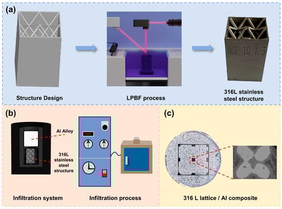 Fabrication process flow chart of the aluminum matrix composites: (a) LPBF process and the 316L lattice reinforcement prepared by LPBF; (b) infiltration system; (c) 316L lattice-reinforced Al matrix composites prepared by infiltration.