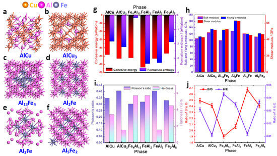 Thermodynamic and mechanical properties of different intermetallic compounds: (a) AlCu atomic model; (b) AlCu3 atomic model; (c) Fe4Al14 atomic model; (d) FeAl2 atomic model; (e) FeAl3 atomic model; (f) Fe2Al5 atomic model; (g) cohesive energy and formation enthalpy; (h) variations in bulk modulus, shear modulus, and Young’s modulus; (i) variations in Poisson’s ratio and hardness; (j) B/G and H/E ratios.