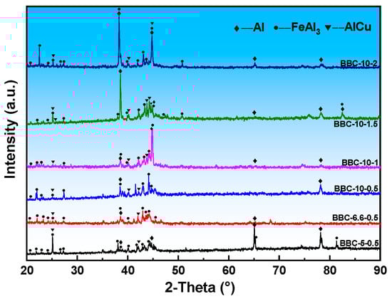 Figure 6 shows the metallographic structure of aluminum matrix composites with different samples. Figure 6a shows the typical microstructure of BCC-5-0.5 sample. Dark gray lath precipitates and bright white irregular block precipitates can be observed in the aluminum matrix. The dark gray precipitates are relatively coarse, and the slab width or equiaxed size is about 20–50 μm. In contrast, the size of bright white precipitates are about 5 μm, but they show irregular shapes and uneven distribution, showing obvious local aggregation characteristics. In addition, there are also a small amount of micro-porosity defects caused by poor melt fluidity or solidification shrinkage in the aluminum matrix. When the lattice unit cell length increases to 6.6 mm, the microstructure of the BCC-6.6-0.5 sample changes significantly. Compared with BCC-5-0.5, the dark gray lath phase becomes coarse, and the maximum lath width is about 80 μm. At the same time, the number of bright white phases increases, and the distribution is still uneven. Although the increase in lattice constant improves the macroscopic permeability, it also produces a new local stagnation zone. In these regions, the melt flow velocity decreases, while the local contact time between the aluminum melt and the stainless steel is prolonged. This provides favorable conditions for the diffusion of Fe and Cu elements and the coarsening of precipitated phases.