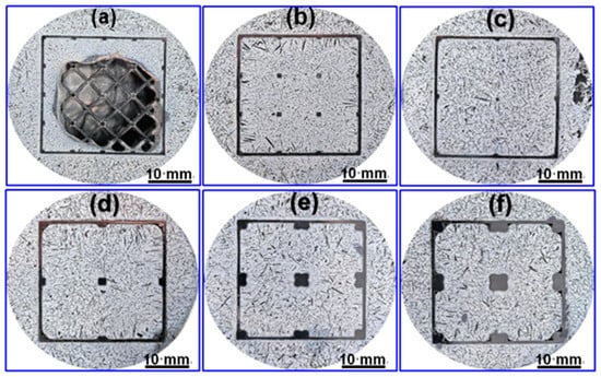 Figure 5 shows the macroscopic morphology of BCC lattice-reinforced aluminum matrix composites with different aspect ratios. As shown in Figure 5a, there are unfilled pores in the BCC-5-0.5 sample. The main reason is that the wettability between the aluminum melt and the stainless steel is poor, which hinders the penetration under capillary drive. At the same time, the three-dimensional path of the lattice structure is highly tortuous, the melt flow resistance is large, and the momentum is easily dissipated before complete filling. In addition, needle-like precipitates can be seen in the matrix around the sample skeleton. The wettability between the melt and the skeleton and the lattice geometry are the key interface factors that determine the permeability integrity. The BCC-5-0.5 lattice structure has a high tortuosity flow channel, and the capillary resistance is dominant. Without surface modification of the skeleton, it is difficult for gravity to drive the melt to completely overcome the resistance, resulting in residual pores. Optimizing lattice geometry can effectively improve the infiltration behavior. When the diameter is fixed at 0.5 mm and the lattice unit cell length increases to 6.6 mm, as shown in Figure 1, the flow channel of sample BCC-6.6-0.5 is widened, the viscous resistance is reduced, and the melt is fully filled. In addition, a large number of needle-like precipitates growing inward are observed. When the lattice unit cell length increases to 10 mm (BCC-10-0.5), the flow channel is more open, the flow resistance is further reduced, and the number of hard phases growing along edge of the skeleton decreases. Therefore, better infiltration effect can be obtained by adjusting the lattice structure. When the lattice unit cell length is fixed to 10 mm and the lattice diameter is increased to 1 mm, 1.5 mm, and 2 mm, (BCC-10-1, BCC-10-1.5, BCC-10-2), the thicker pillar significantly improves the high-temperature stiffness of the frame, ensures the stable and rapid filling of the molten aluminum, shortens the penetration time, and avoids local blockage caused by structural softening or excessive interface reaction, thereby obtaining uniform and complete macroscopic forming (Figure 5d–f). In summary, infiltration integrity can be controlled by lattice geometry. The comparison between BCC-5-0.5 and BCC-10-1 shows that, under the premise of not changing the wettability of the interface, broadening the flow channel and enhancing the structural stability by optimizing the aspect ratio can compensate for the lack of wettability and achieve complete filling.