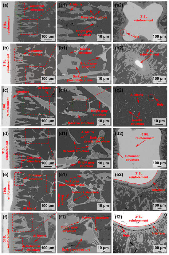 BSE images of 316L lattice/Al composite interface region with different aspect ratios: (a–a2) BCC-5-0.5; (b–b2) BCC-6.6-0.5; (c–c2) BCC-10-0.5; (d–d2) BCC-10-1; (e–e2) BCC-10-1.5; (f–f2) BCC-10-2.