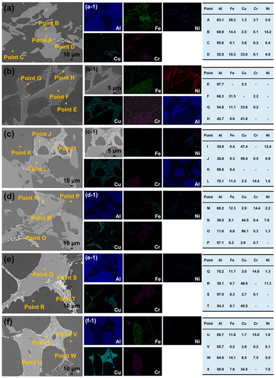 To precisely analyze the micro-phase composition and elemental spatial distribution characteristics within the framework region of the BCC-10-1 sample, EPMA characterization was performed. Figure 11 presents the elemental mapping results of the matrix region in the BCC-10-1 sample. The results indicate that the large, light-gray contrast phase within the sample’s framework region contains a high concentration of Fe, while the contents of Cu and Ni are relatively low. This is consistent with the previously identified phase being FeAl3. In sharp contrast, the network structure widely distributed in the gaps of the FeAl3 phase or attached to its surface shows almost no signal in the Fe elemental channel in the EPMA maps. However, it exhibits very high signal intensity in the Cu elemental channel, confirming that this network phase is the AlCu phase.