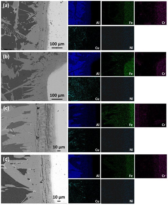 According to the EDS element distribution map (Figure 8 and Figure 9) and the corresponding point analysis results, the diffusion behavior and interfacial reaction characteristics of different elements in the composite material are clearly revealed. Fe is mainly enriched in the stainless steel skeleton and the adjacent interface area, and its content in the matrix precipitates (such as point A, F, L, M, Q, U) formed after partial interface reaction is high, and there is a sign of diffusion into the aluminum matrix. Cu is mainly enriched in bright white precipitates (such as D, G, J, O, Q, U). Cr and Ni elements are mainly retained in the reinforcement, but Cr is observed to be distributed in the dark gray hard phase in multiple interface areas such as D, G, J, N, R, T, and X. Because the atomic radius and electronegativity of Cr and Fe are similar, Cr can easily replace Fe, so it is speculated that an (Fe, Cr)Al3 intermetallic compound is formed. This phenomenon is closely related to the enhancement of element diffusion ability under solid–liquid reaction conditions. Fe atoms diffuse into the matrix Al, forming a composition gradient in the interface region. For example, the aluminum content of the O point reaches 86.1 %, indicating deep penetration and participation in the interfacial reaction. With the increase in element interaction, a variety of intermetallic compounds, such as iron-rich phases (e.g., FeAl3), may be formed in the interface region, which is related to the non-equilibrium diffusion and reaction kinetics at high temperature. The composition of some regions (such as K, P, S, and V points) is close to that of pure aluminum, indicating that these regions are areas where no obvious reaction occurs in the aluminum matrix.